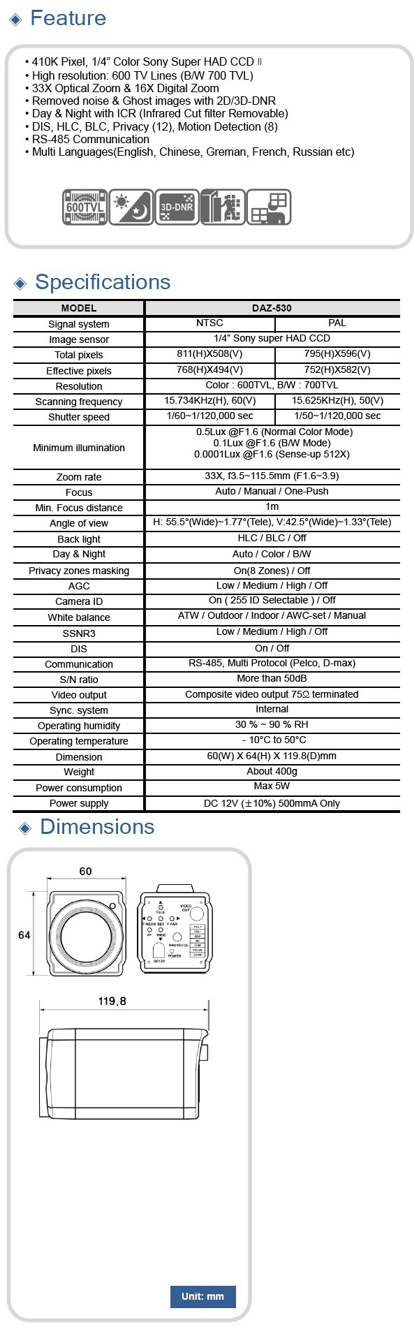 41¸¸È­¼Ò, ±¤ÇÐ 33¹èÁÜ, 600TVL, 0.00004Lux, True D&N, Digital WDR